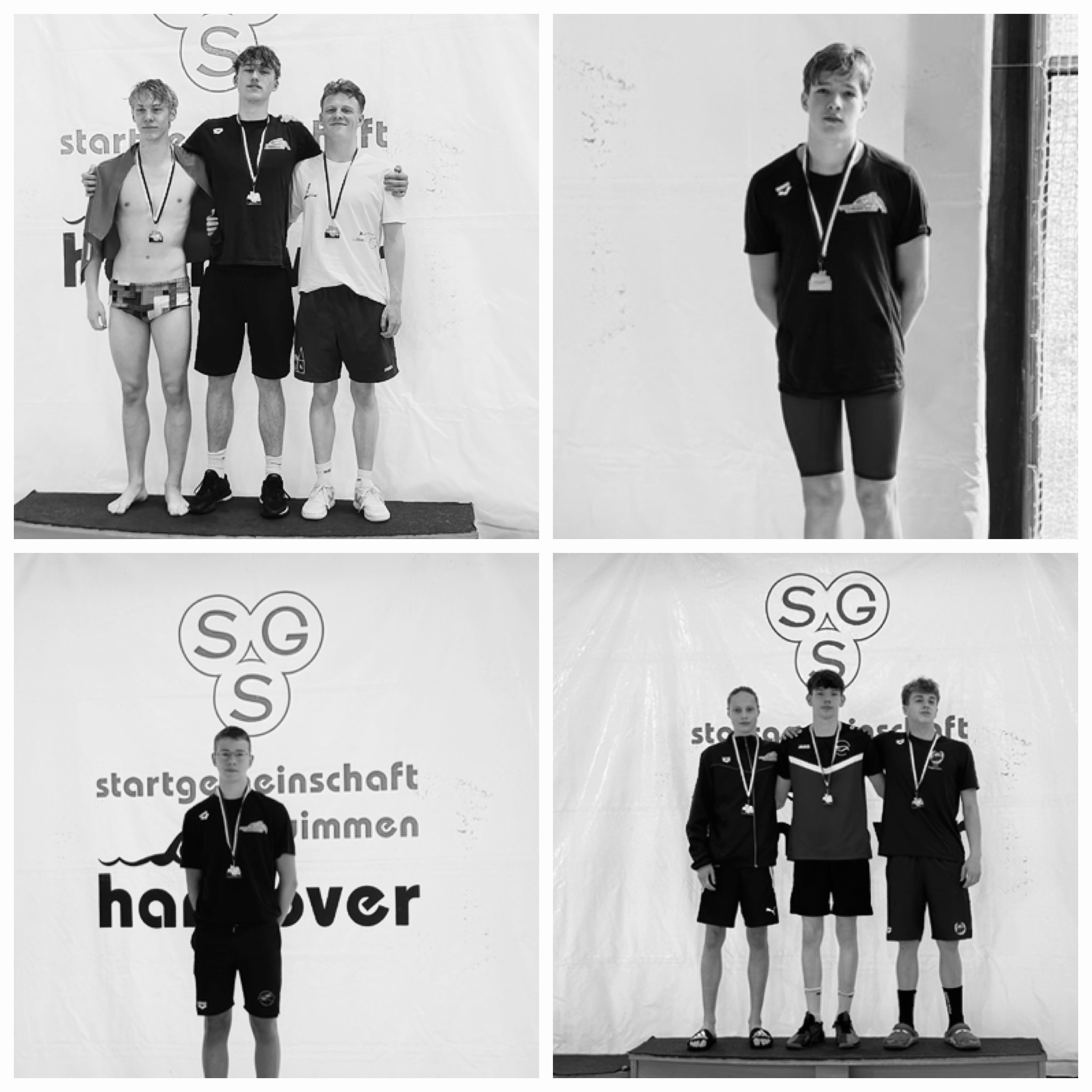 Am Sonntag stand dann der finale Wettkampftag auf dem Programm. Auch hier wurde nahtlos an die bisher absolvierten guten Wettkampftage angeknüpft. Denis sicherte sich auch noch den Titel über die 100 m Rücken in 1:02,61 und auch Faddey Baromenskiy konnte sich seinen ersten Norddeutschen Meistertitel und zwar über die 100 m Brust in 1:12,86 sichern. Ole, der am Freitag noch hauchdünn seine erste Medaille über die 50 m Schmetterling verpasste konnte nun in einer krassen Zeit von 0:25,76 über 50m Freistil Norddeutscher Vizemeister werden. Ben David (Jg.09), der aus dem vollen Training an den Start ging, hatte ein wenig Pech, dass er mit einer tollen Lagen-Bestzeit von 2:17, die für einen Titel gereicht hätte aufgrund eines angeblichen Wenden-Fehlers disqualifiziert wurde. Auch die anderen Starter konnten mit neuen Bestzeiten überzeugen wie Greta Roeske (Jg.10) über 200 m Freistil in 2:15,13, Luise Niebisch (Jg.10) über 50 m Freistil in 0:29,86, Hector Kerkides (Jg.11) über 50 m S in 0:29,09, sowie Niklas Siedler (Jg. 09) über 50 m S in 0:27,3. Auch für Hanzade Yigit (Jg.09) ging die Formkurve wieder hoch mit neuen Saison-Bestzeiten über die Bruststrecken. Schlusspunkt einer tollen Meisterschaft bildete die 4 x 100 m Lagenstaffel der Männer in der Besetzung: Denis Arnold (R), Anton Freimark (B), Ben Köckritz (D) und Ben David Preuß (K). Die letzten Meter über die Freistil-Strecke waren an Spannung nicht zu unterbieten, aber am Ende wurde die Staffel noch als dritter in Ziel gebracht. Völlig entkräftet, aber glücklich ging es sofort danach ins Ausschwimmbecken.